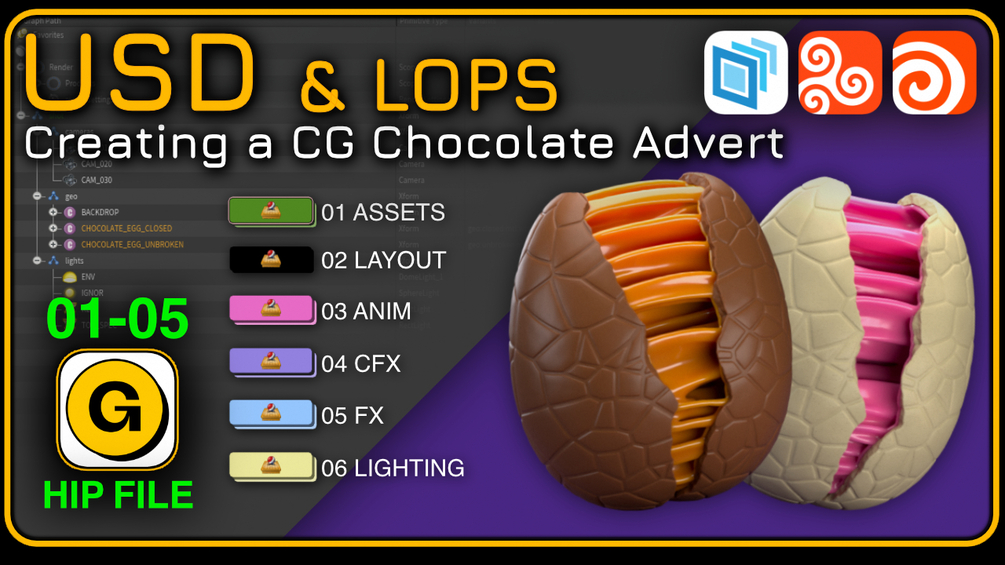 🥚 Tutorial Overview • Project: Fake social media advert for a chocolate egg. • Focus: Workflow using Houdini LOPs & USD in a single scene, split into department-style networks. • Goal: Simulate a VFX pipeline (01 ASSETS → 02 LAYOUT → 03 ANIM → 04 FX → 05 LIGHTING).
